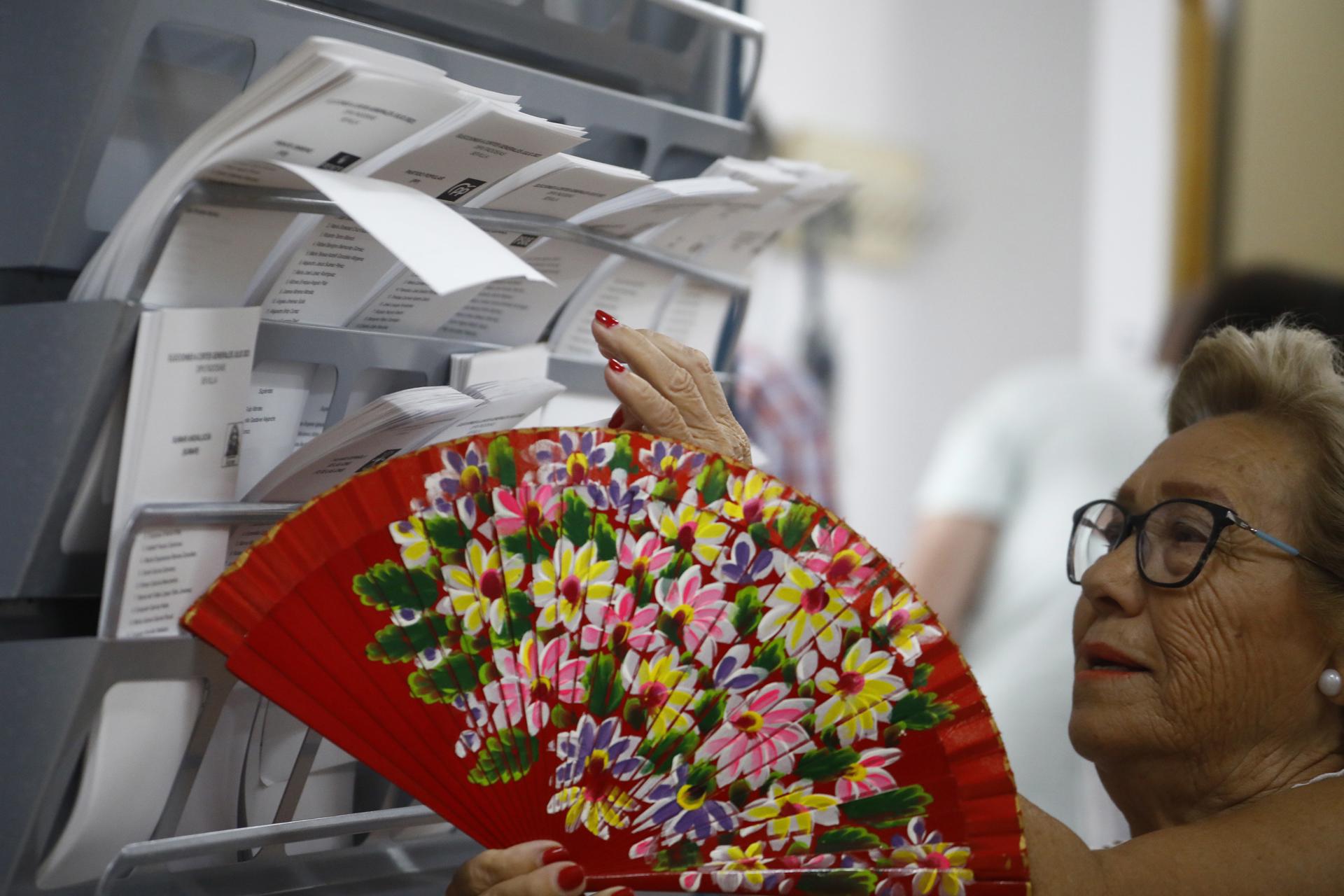 Una mujer con abanico elige una papeleta para ejercer su derecho al voto en el Colegio Miguel de Cervantes de Écija (Sevilla) Noticias relacionadas