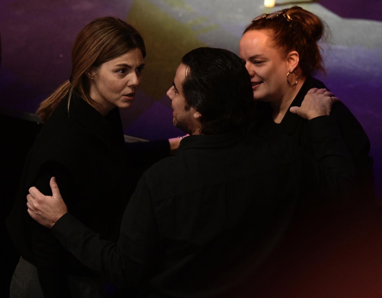 La actriz Manuela Velasco (i) durante su visita la capilla ardiente de la actriz y cantante Concha Velasco, instalada este sábado en el Teatro de La Latina de Madrid. La artista vallisoletana falleció hoy a los 84 años en el Hospital Puerta de Hierro Maja