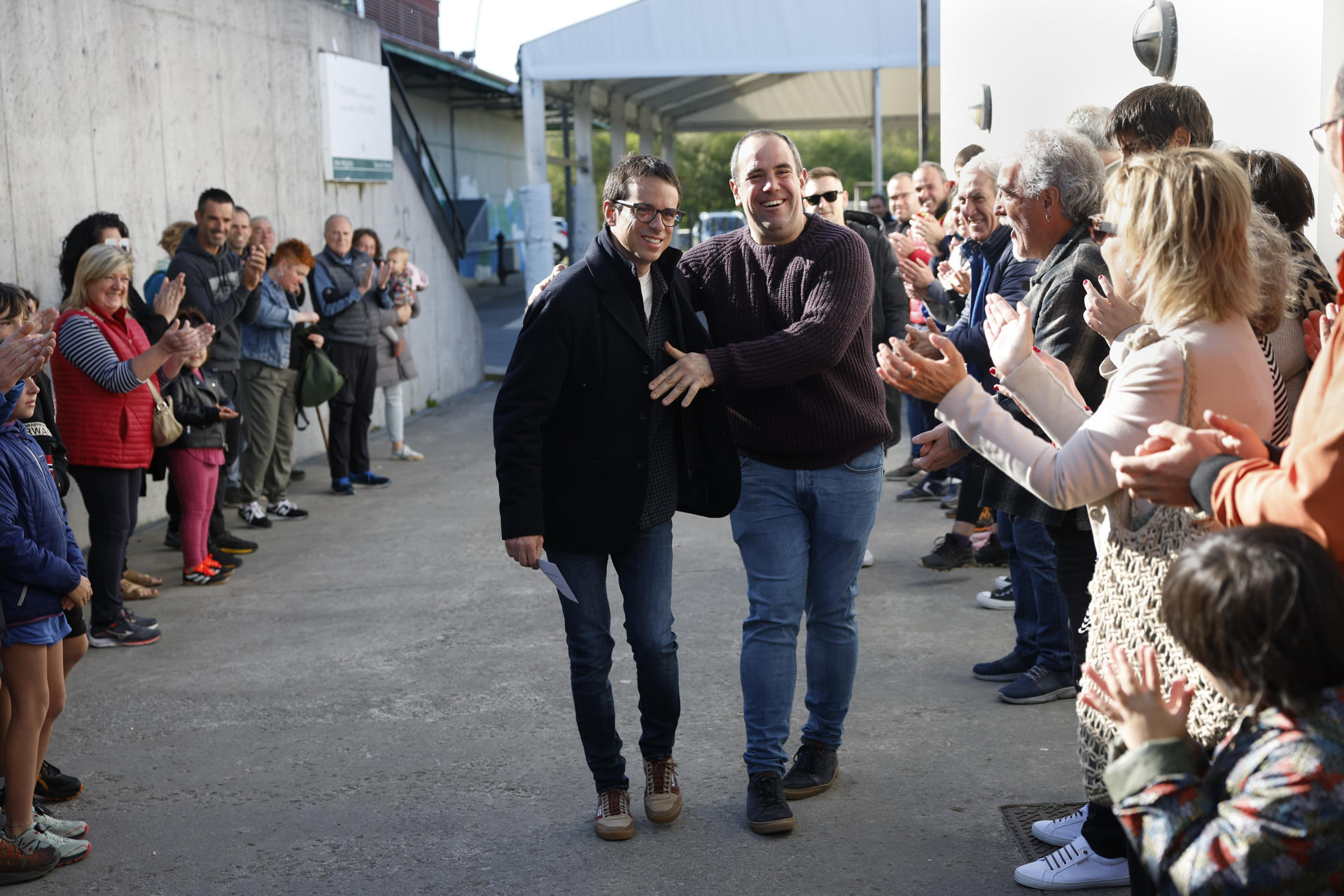 El candidato de EH Bildu a lehendakari Pello Otxandiano (c) saluda a simpatizantes a su llegada a un colegio electoral en Oxandio, Bizkaia, para ejercer su derecho al voto en las elecciones al Parlamento Vasco, este domingo.Noticias relacionadas