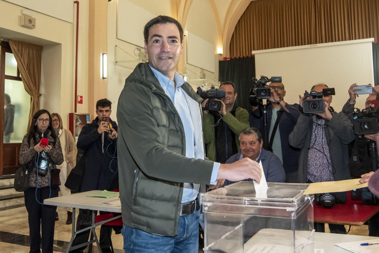 El candidato a lehendakari del PNV, Imanol Pradales, ejerce su derecho al voto en el Centro Cultural Santa Clara de Portugalete (Bizkaia), este domingo.Noticias relacionadas