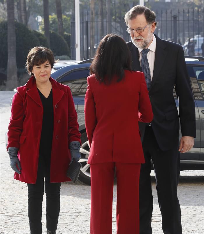 El expresidente del Gobierno Mariano Rajoy, saluda a la presidenta de la Cámara autonómica, Marta Bosquet (c), junto a la exvicepresidenta Soraya Saenz de Santamaría, a su llegada al Parlamento andaluz en Sevilla para el acto de toma de posesión del líderNoticias relacionadas