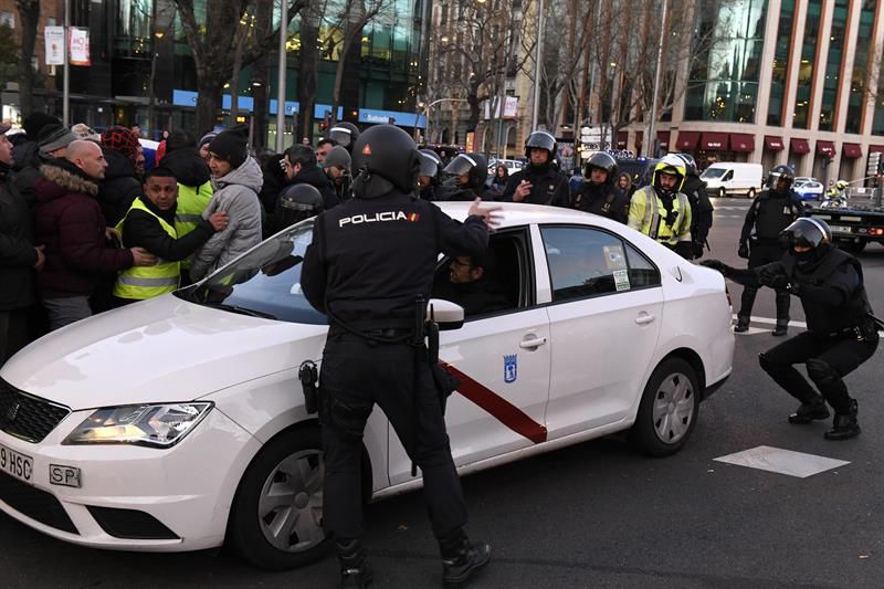 Agentes de la Policía Nacional proceden a desalojar a los taxistas que permanecen acampados desde ayer sábado en el Paseo de la Castellana de Madrid y que cumplen este lunes su primera semana de huelga, en su protesta por la regulación de los vehículos deNoticias relacionadas