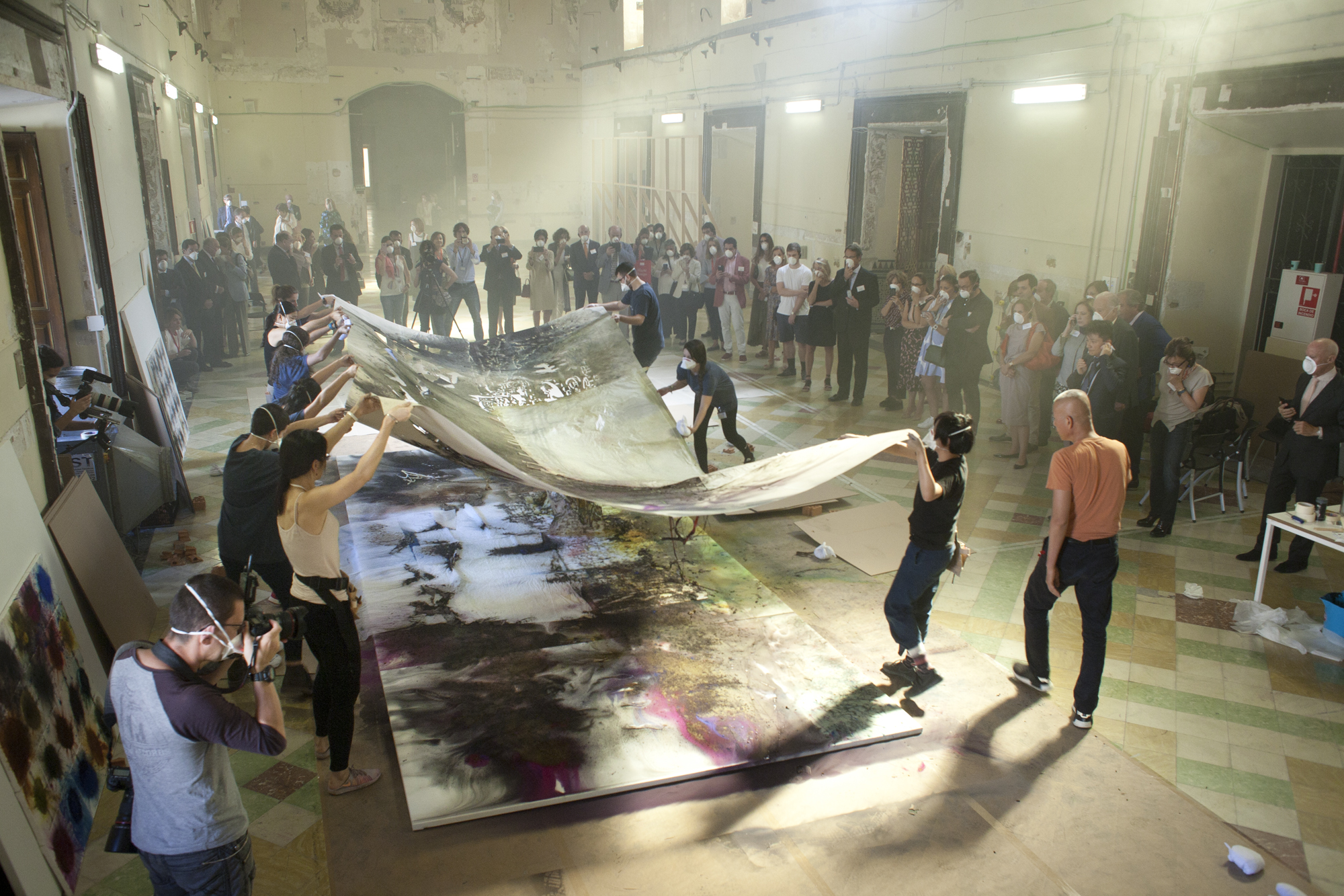 Cai Guo-Qiang y los voluntaries durante el proceso de creación con pólvora de la pintura Day and Night in Toledo