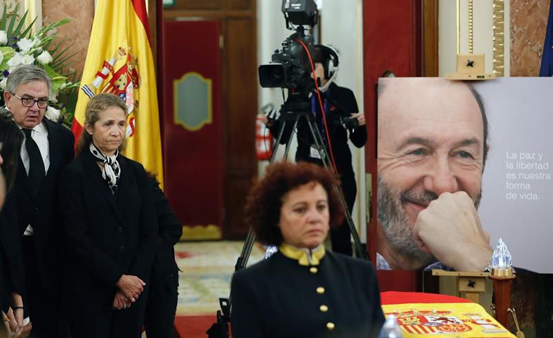 La Infanta Elena (i), en la capilla ardiente del exvicepresidente del Gobierno Alfredo Pérez Rubalcaba, instalada en el Congreso de los Diputados.Noticias relacionadas