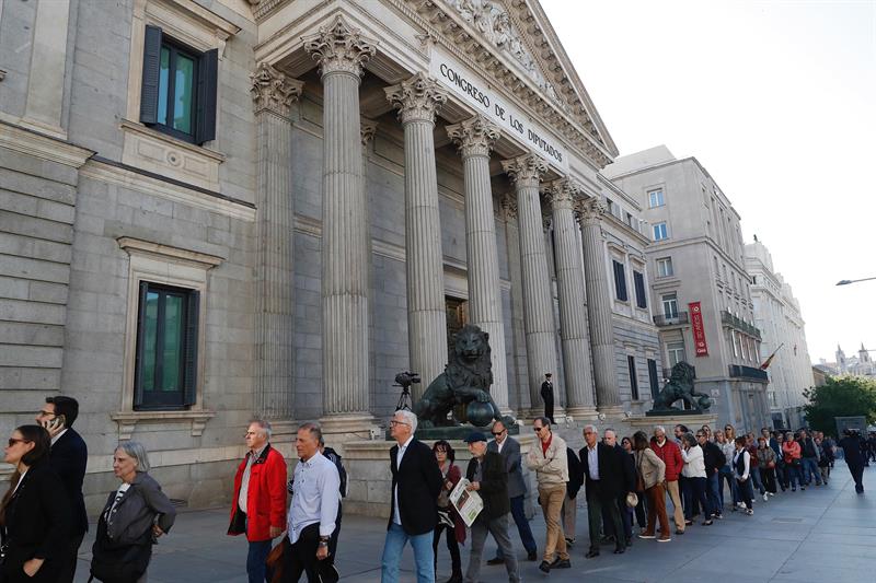Numeroso público aguarda para entrar en la capilla ardiente del exvicepresidente del Gobierno Alfredo Pérez Rubalcaba, instalada en el Congreso de los Diputados.Noticias relacionadas