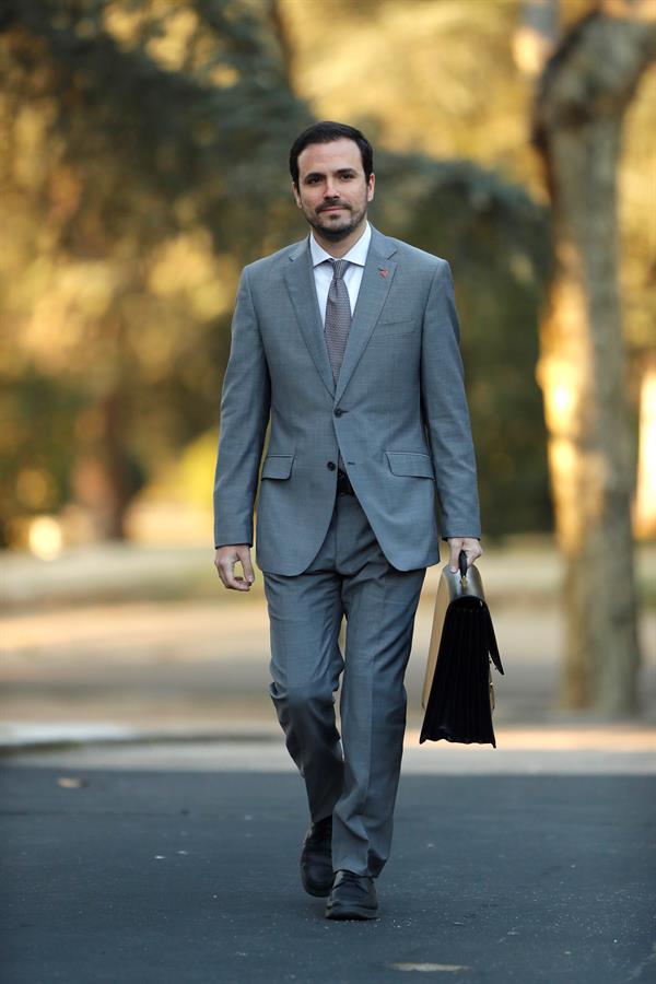 El ministro de Consumo, Alberto Garzón, llega al Palacio de la Moncloa para asistir al primer Consejo de Ministros del Gobierno de coalición presidido por Pedro Sánchez, este martes en Madrid.Noticias relacionadas