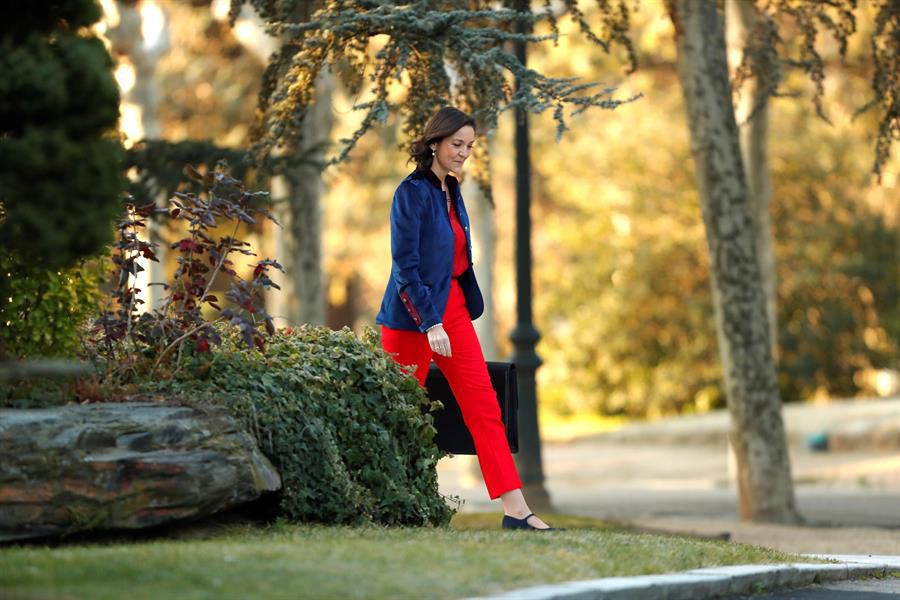 La ministra de Industria, Comercio y Turismo, Reyes Maroto, llega al Palacio de la Moncloa para asistir al primer Consejo de Ministros del Gobierno de coalición presidido por Pedro Sánchez, este martes en Madrid.Noticias relacionadas