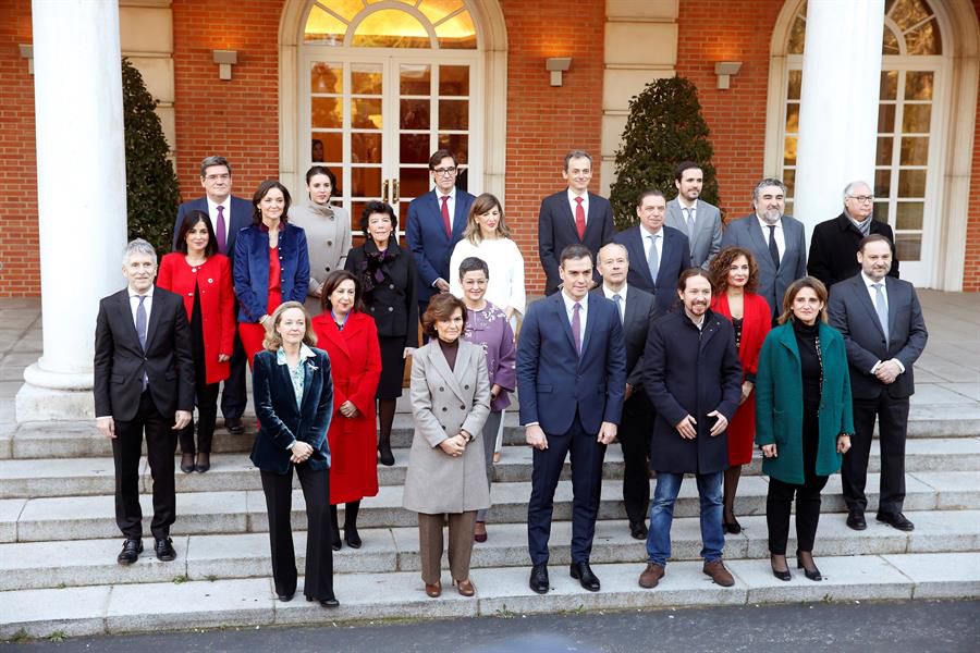 El presidente del gobierno, Pedro Sánchez (c) posa junto con los miembros de su gabinete en la foto de familia en la Moncloa antres del primer Consejo de Ministros del Gobierno de coalición presidido por Pedro Sánchez, este martes 14 de enero en Madrid.Noticias relacionadas