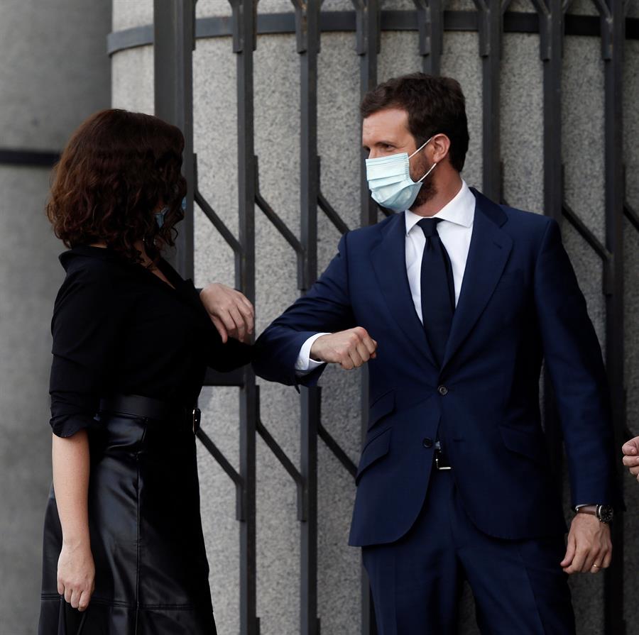 La presidenta de la Comunidad de Madrid, Isabel Díaz Ayuso, saluda al líder del PP, Pablo Casado.
