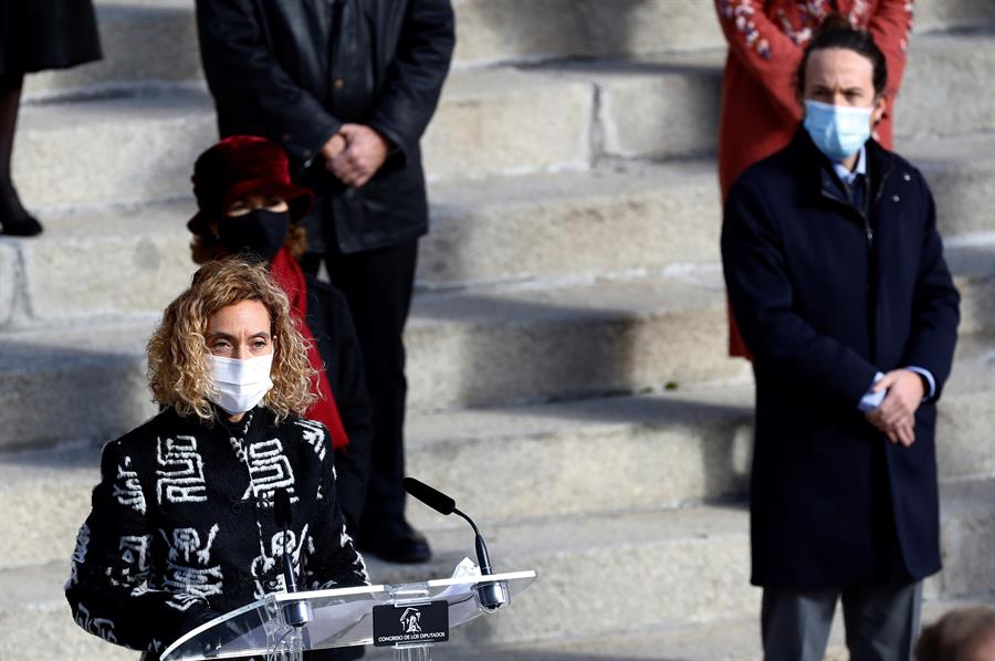 La presidenta del Congreso, Meritxell Batet, junto al vicepresidente segundo del Gobierno, Pablo Iglesias, pronuncia un discurso durante en la celebración del cuadragésimo segundo aniversario de la Constitución este domingo en la escalinata del Congreso dNoticias relacionadas