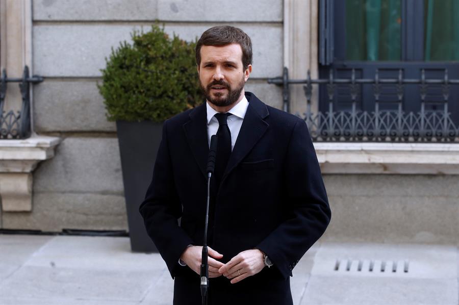 El presidente del PP, Pablo Casado, pronuncia unas palabras a su llegada este domingo al Congreso de los Diputados para asistir a la celebración del cuadragésimo segundo aniversario de la Constitución en Madrid.Noticias relacionadas