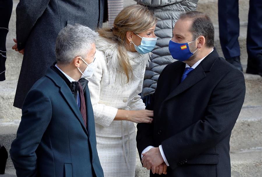 Los ministros de Interior, Fernando Grande-Marlaska (i); Trabajo, Yolanda Díez, y Transportes, José Luis Ábalos, conversan este domingo en la escalinata del Congreso de los Diputados durante la celebración del cuadragésimo segundo aniversario de la ConstiNoticias relacionadas