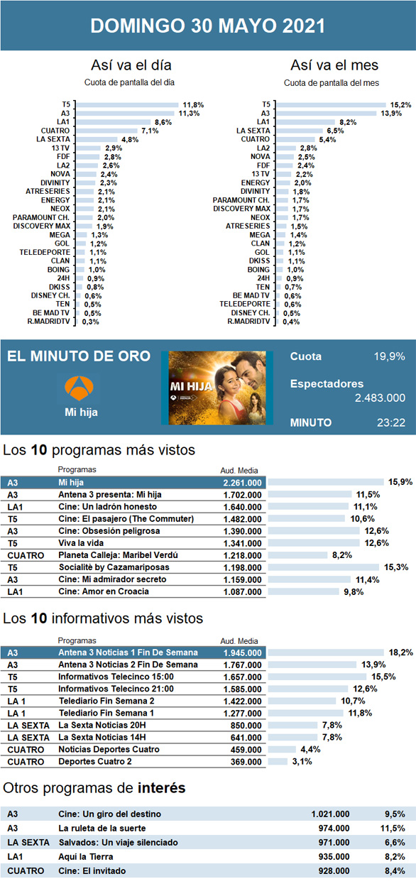 Aunque la serie turca Mi hija mantuvo su puesto como líder indiscutible del domingo, en esta ocasión notó una leve caída en su número de espectadores, pese a mejorar su cuota de pantalla.