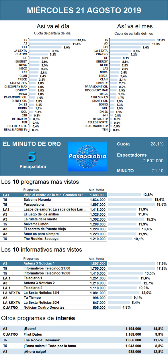 Muy de cerca les siguió Telecinco, que vivió un fuerte ascenso gracias a medio millón más de interesados en la serie The Rookie que la semana pasada. Mucho menor fue el crecimiento de Cuatro, pues su especial veraniego de En el punto de mira rondó los 800.000 espectadores. La película de La Sexta repitió como última alternativa de la noche con medio millón de interesados en la cinta Kick-Ass 2: Con un par, la mitad de audiencia que el miércoles anterior.