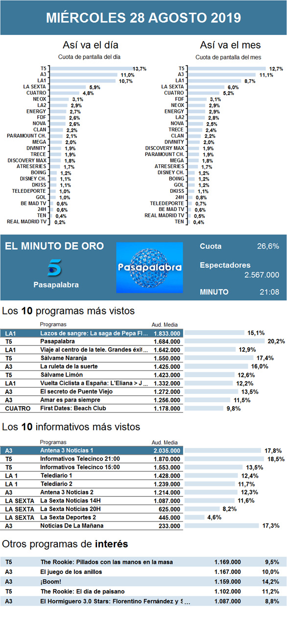 Telecinco logró alzarse como segunda opción de la noche con la serie The Rookie, pese a un sutil descenso en su audiencia. Muy de cerca le siguió Antena 3, que pasó a ocupar el tercer puesto nocturno por la considerable caída con El juego de los anillos. El concurso, con su cuarta entrega, obtuvo sus peores registros tras una reñida batalla por el liderazgo durante las semanas anteriores.