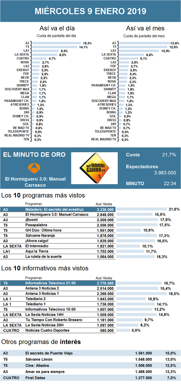 Por quinto día consecutivo, Antena 3 mantuvo el liderazgo de la noche. En esta ocasión fue gracias al estreno de su serie Matadero, que reunió a más de 3,3 millones personas frente al televisor.