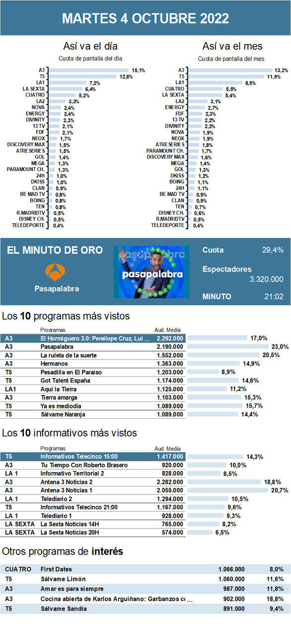 AUDIENCIAS: MARTES 4 DE OCTUBRE DE 2022