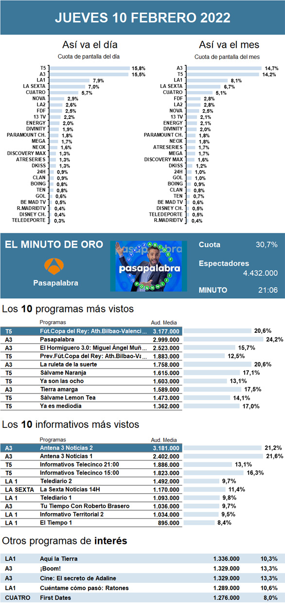 Aunque el partido de la Copa del Rey entre el Athletic de Bilbao y el Valencia no consiguió igualar los excelentes datos del encuentro de la semana pasada, sí se mantuvo como líder del 'access' y como programa de entretenimiento más visto del día.