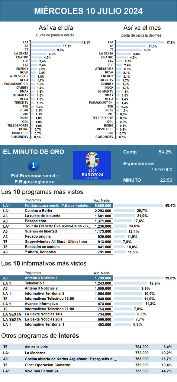AUDIENCIAS: MIÉRCOLES 10 DE JULIO DE 2024