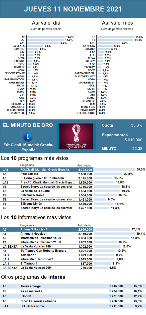 Este jueves, arrasó si rival el partido de clasificación para el Mundial de 2022, que terminó con la victoria de España frente a Grecia. Además, el efecto arrastre del encuentro, supuso los mejores datos de esta temporada para HIT, emitida justo a continuación en La 1.