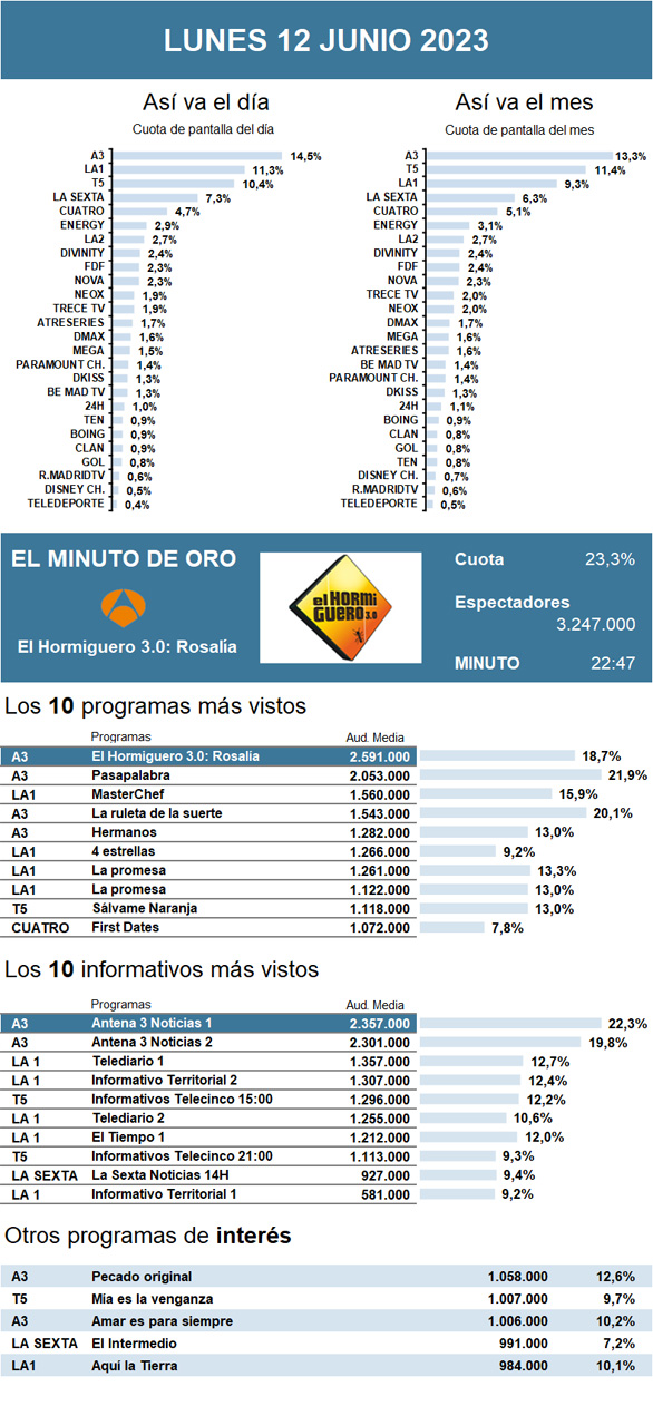 AUDIENCIAS: LUNES 12 DE JUNIO DE 2023