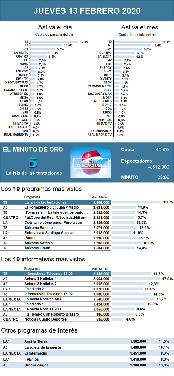 La isla de las tentaciones fue el espacio que se alzó como apuesta principal del día y como minuto de otro gracias a su prolongación del programa. Con un reencuentro seis meses después del final de grabación, el 'reality' no sólo alcanzó sus mejores datos en Telecinco, sino que mejoró con respecto a su gran final y batió su récord de audiencia en Mediaset.