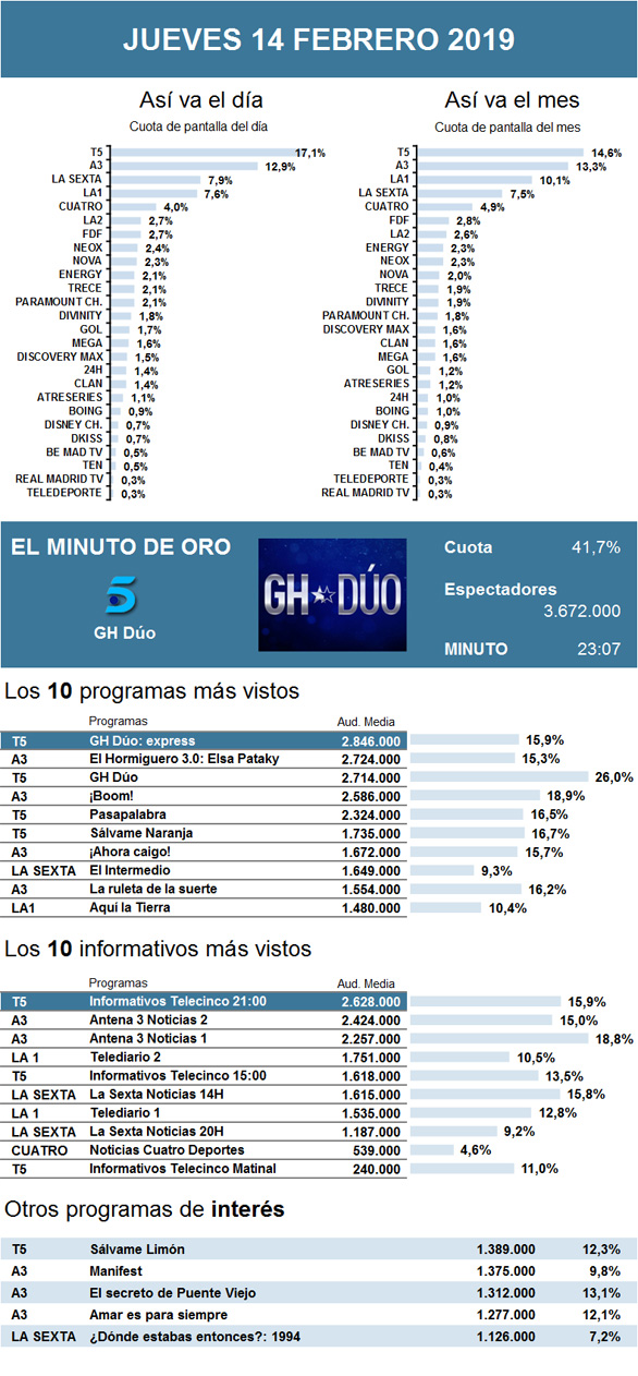 Aunque este jueves GH Dúo no logró batir el récord de su semana anterior, sí consiguió coronarse como minuto de oro y continuar liderando la noche. Además, el 'reality' de Telecinco alcanzó sus segundos mejores datos de esta edición tras dos semanas de récords continuos.