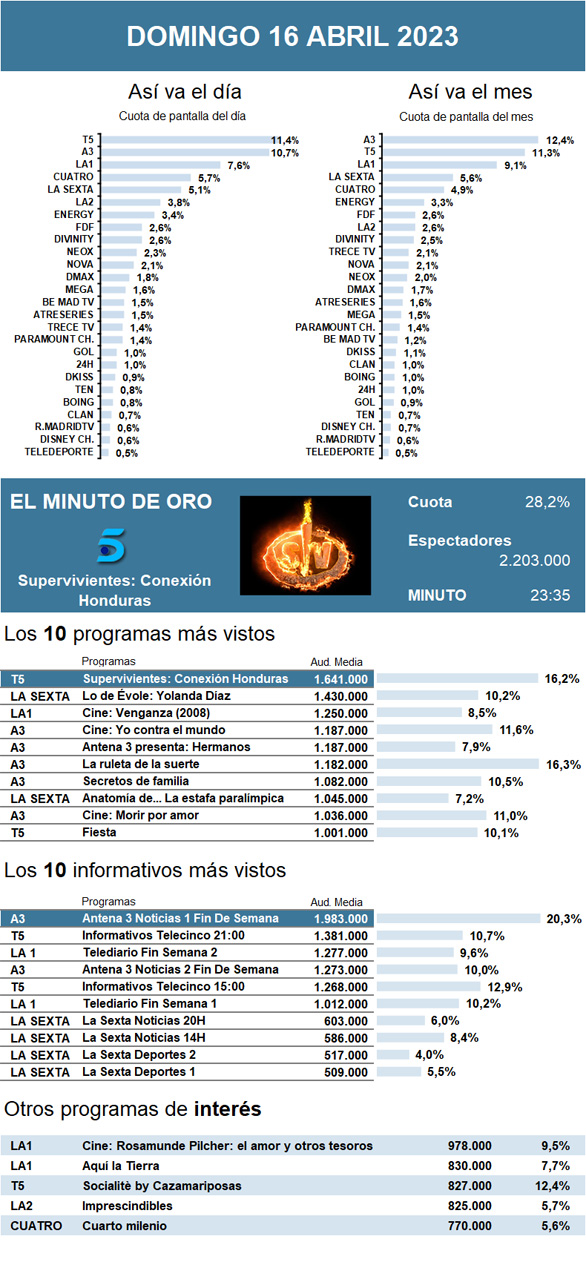 AUDIENCIAS: DOMINGO 16 DE ABRIL DE 2023