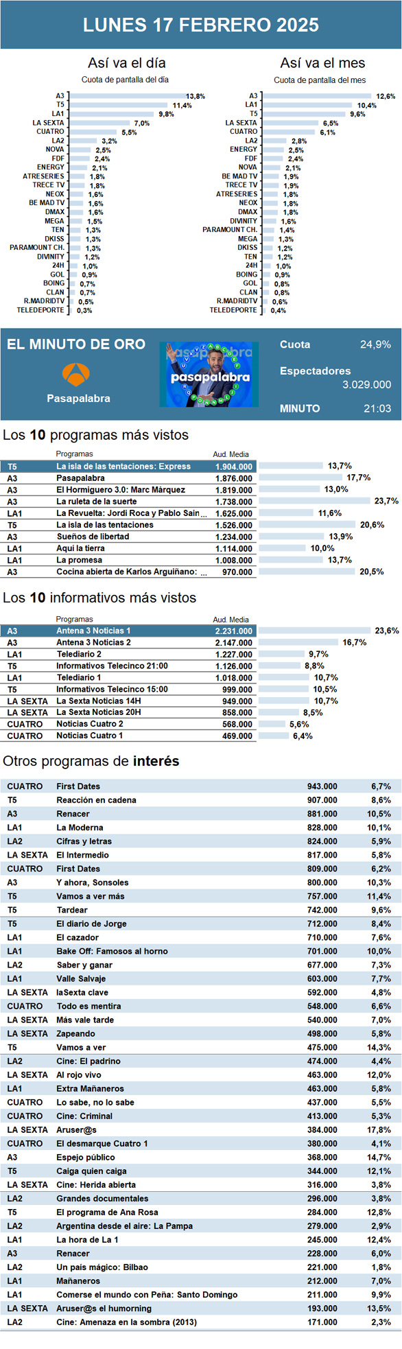 AUDIENCIAS: LUNES 17 DE FEBRERO DE 2025