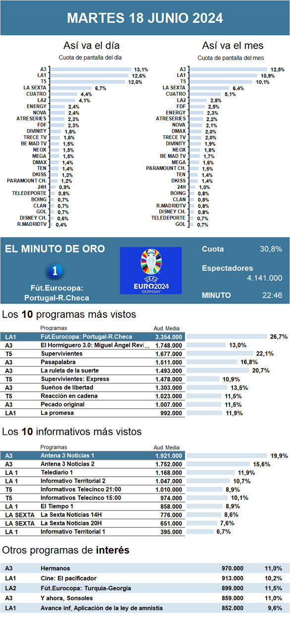 AUDIENCIAS: MARTES 18 DE JUNIO DE 2024
