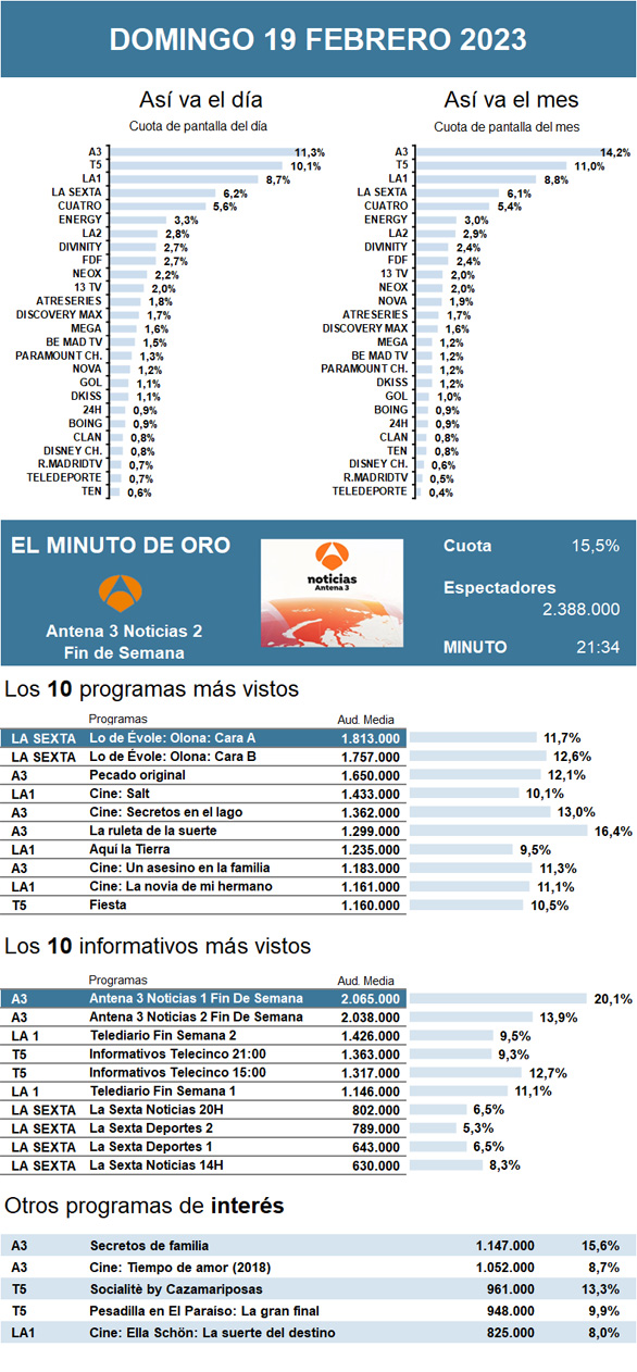 AUDIENCIAS: DOMINGO 19 DE FEBRERO DE 2023