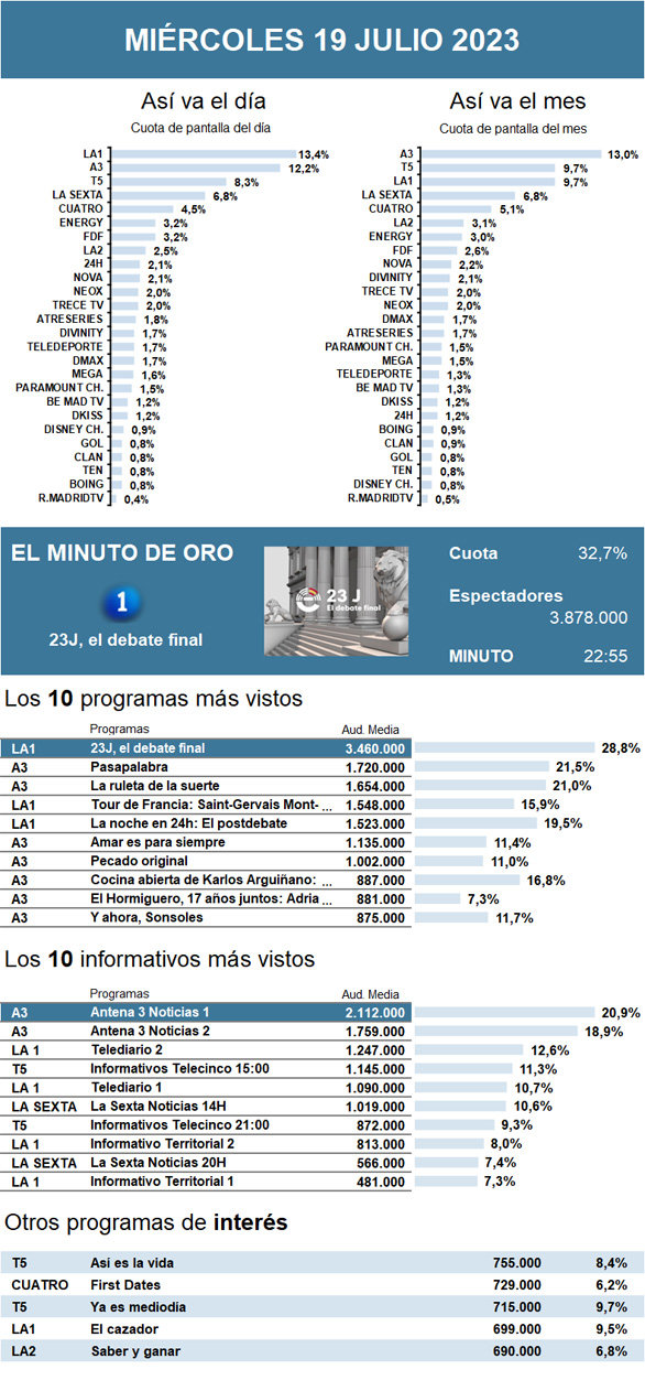 AUDIENCIAS: MIÉRCOLES 19 DE JULIO DE 2023