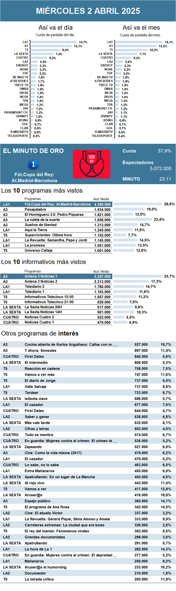 AUDIENCIAS: MIÉRCOLES 2 DE ABRIL DE 2025