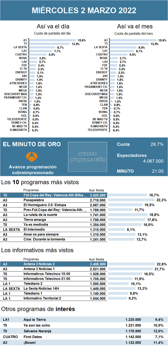 Este miércoles, Telecinco se impuso con el partido entre el Valencia y el Athletic de Bilbao de la Copa del Rey. Sin embargo, como sólo los últimos treinta minutos del encuentro se enfrentaron al resto de ofertas del 'prime time', se podría decir que fue Antena 3 quien conquistó el horario estelar gracias a la película Durante la tormenta.