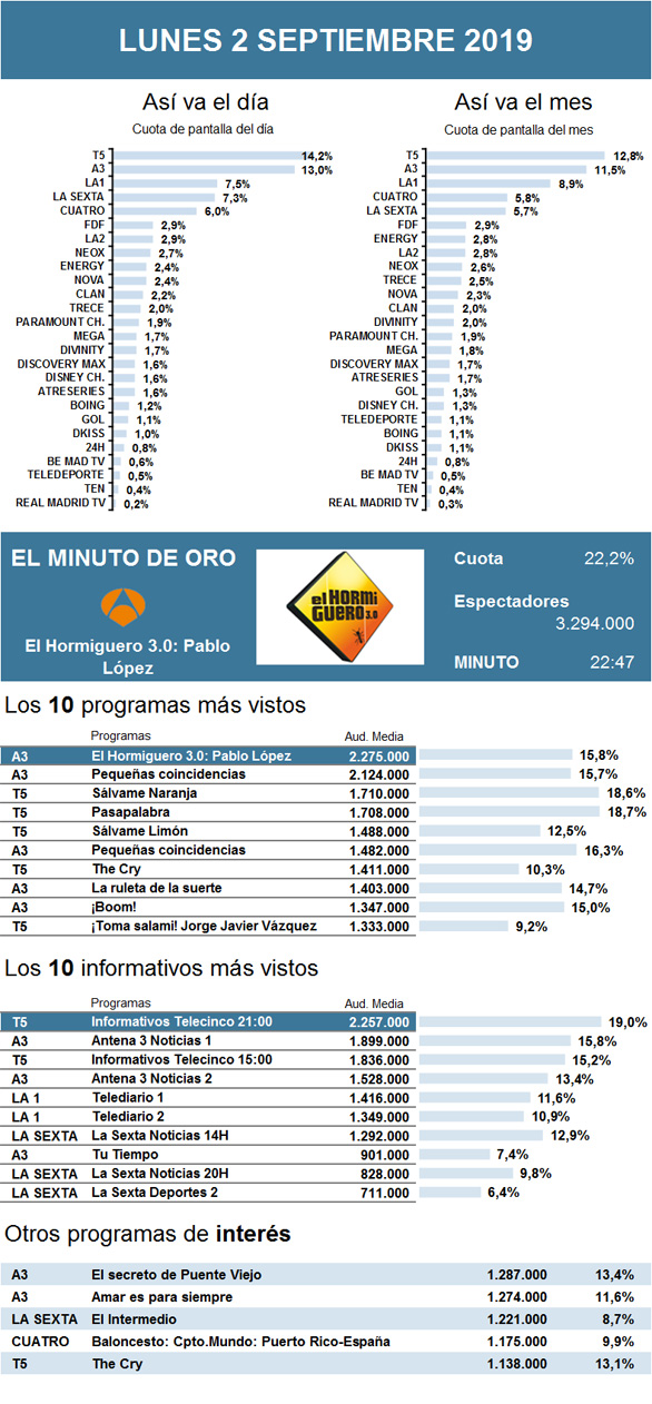 En el primer lunes de septiembre, comienzo del nuevo curso televisivo, Telecinco se mantuvo como cadena favorita del día. Sin embargo, Antena 3 afianzó su liderazgo durante la noche, primero con el regreso de su exitoso El Hormiguero 3.0 y, a continuación, con el estreno de Pequeñas coincidencias. La nueva serie, tras su paso por Amazon, logró duplicar la audiencia que la cadena de Atresmedia obtuvo la semana pasada con el cine.