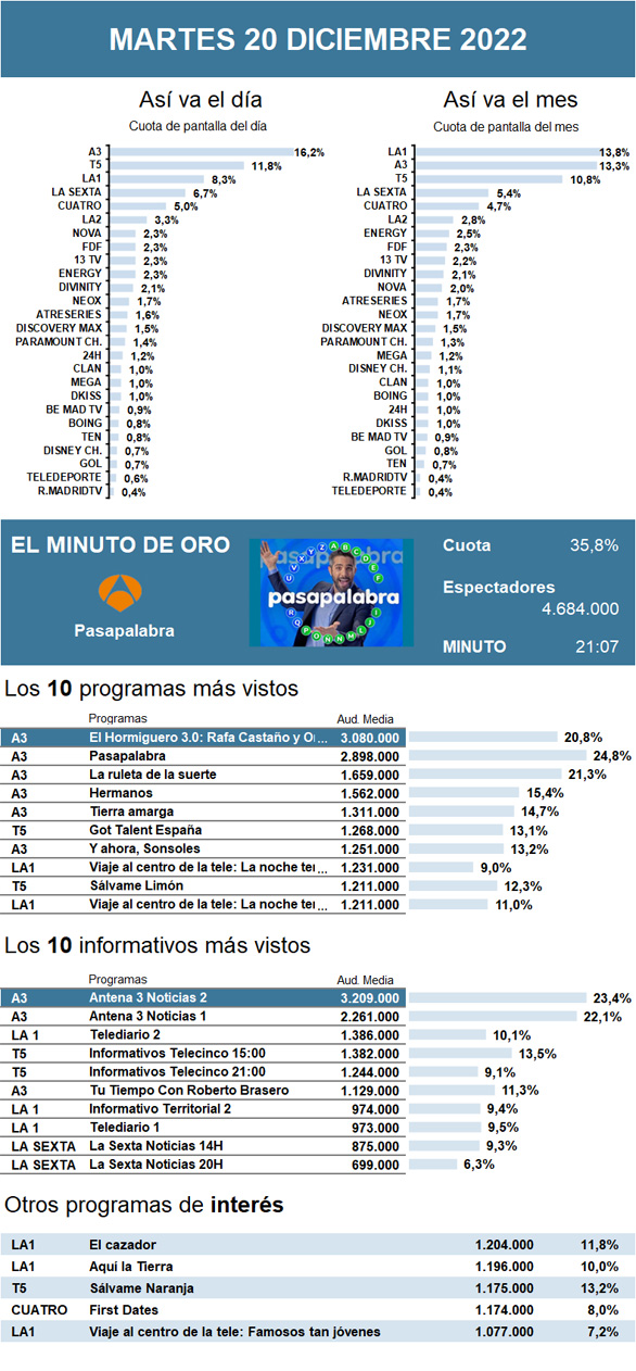 AUDIENCIAS: MARTES 20 DE DICIEMBRE DE 2022