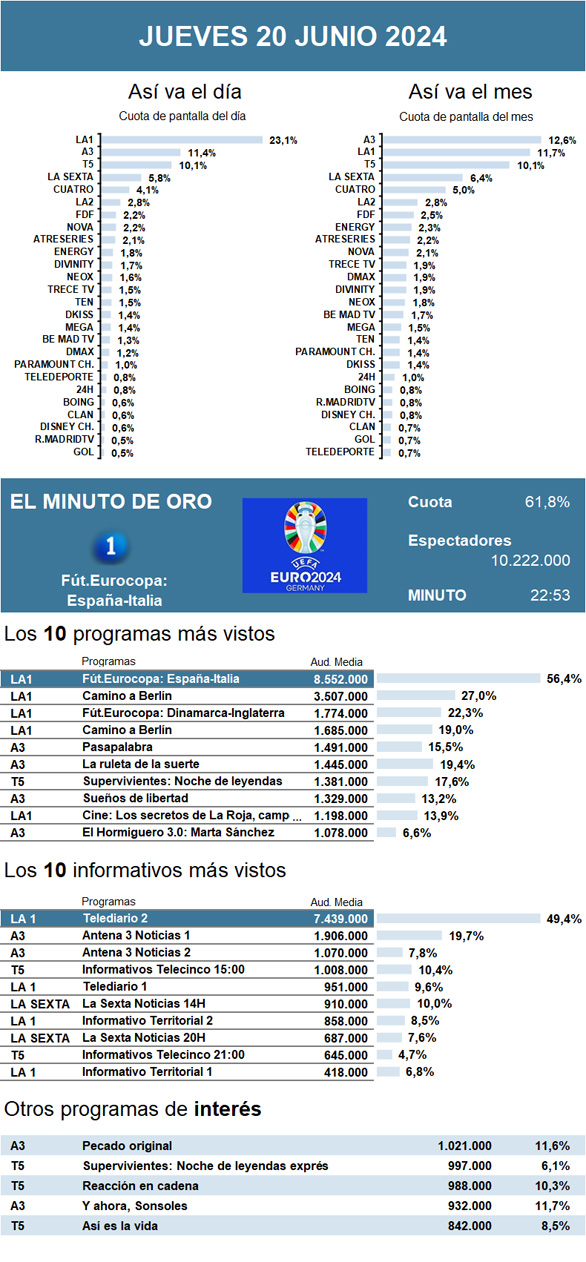 AUDIENCIAS: JUEVES 20 DE JUNIO DE 2024
