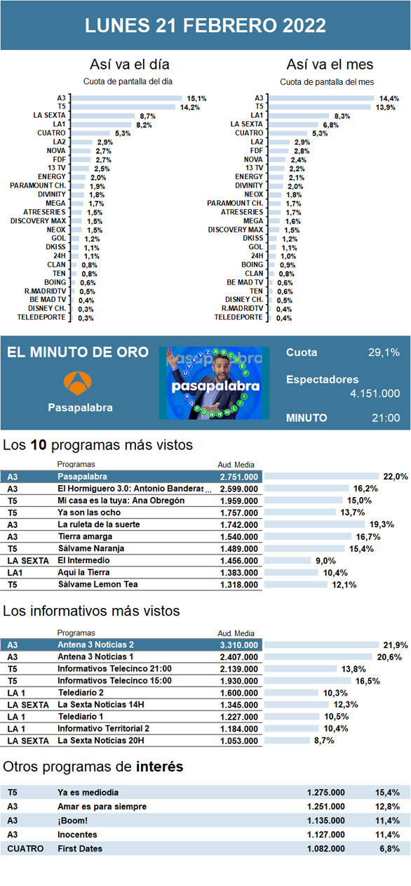 Peor suerte corrió Cuatro que, tras el final de Planeta Calleja hace una semana, en esta ocasión optó por First Dates: Crucero. La cadena no sólo cayó desde el segundo puesto de la semana pasada debido a sólo reunir medio millón de espectadores con el 'reality', sino que tampoco fue rival para el cine de La Sexta y casi igualó los datos del cine clásico de La 2.