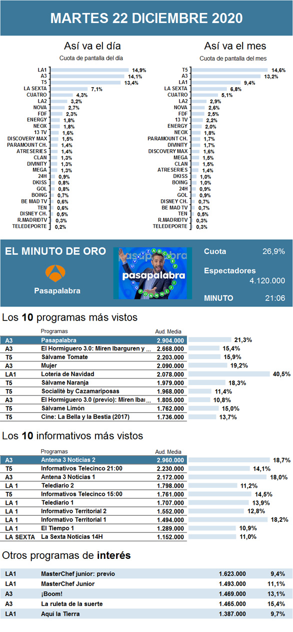 AUDIENCIAS: MARTES 22 DE DICIEMBRE DE 2020