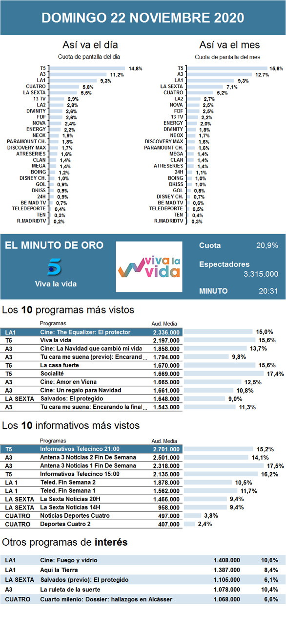 De cerca le siguió Antena 3, que mantuvo los datos habituales de su Peliculón gracias al esperado regreso de su exitoso concurso musical Tu cara me suena que, ocho meses después de su parón debido a la pandemia del coronavirus, optó por la noche del domingo para emitir un especial previo a su recta final.
