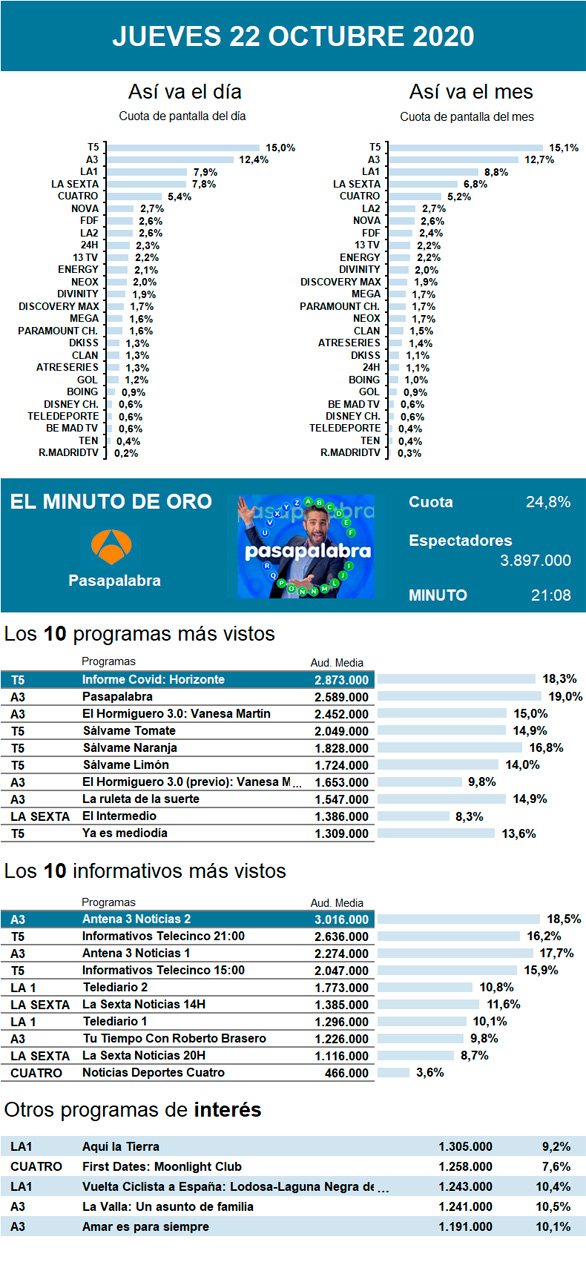 Este jueves sobresalió Informe Covid en Telecinco, que se impuso durante el 'access' y logró relegar a un segundo puesto a El Hormiguero 3.0. El programa presentado por Iker Jiménez obtuvo su mejor audiencia de temporada gracias a su entrevista a la viróloga china Lin-Meng Yan, conocida por asegurar en varios medios que el coronavirus fue artificialmente creado, pese a haber sido desacreditada por diversos expertos.