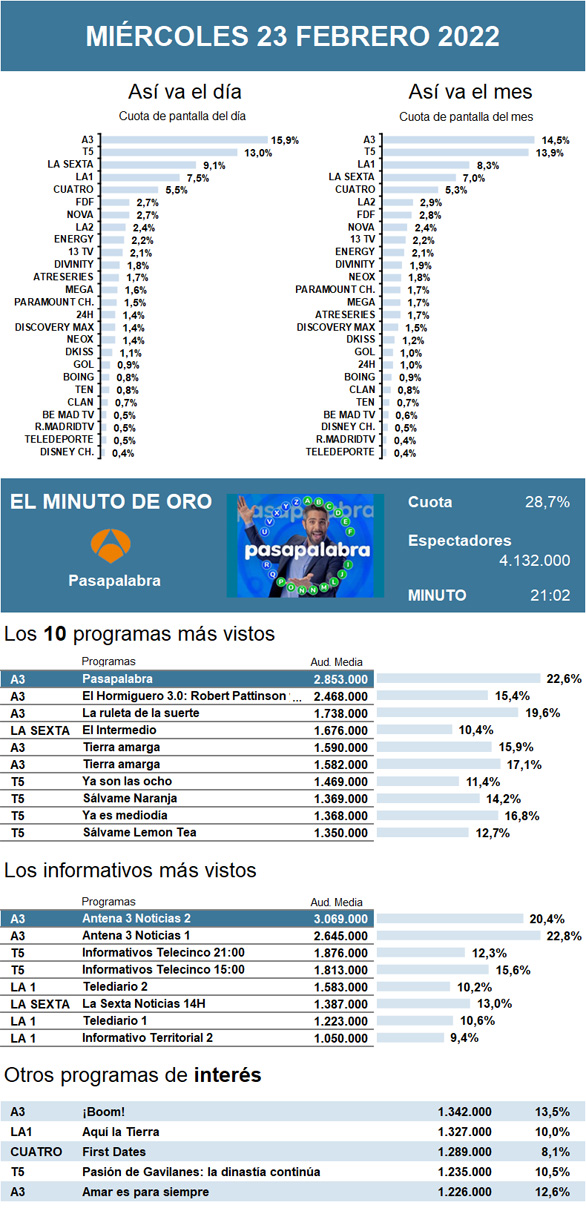 Esto supuso un considerable tropiezo para Pasión de gavilanes: La dinastía continúa, que no sólo cedió el primer puesto nocturno obtenido con su estreno la semana pasada, sino que perdió a cerca de un millón de interesados si se compara la audiencia media obtenida por sus tres capítulos emitidos en esta ocasión con la media de los dos emitidos el miércoles anterior.