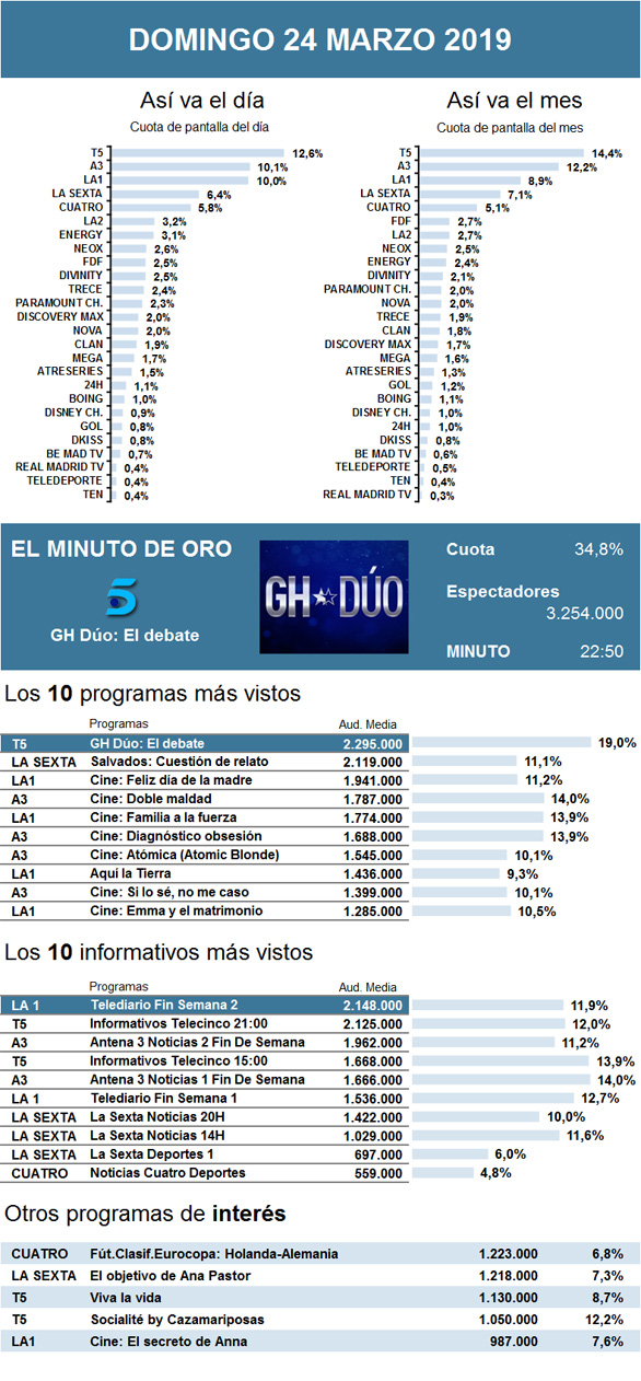 Este domingo GH Dúo: El debate recuperó el puesto como espacio más visto del día, además de repetir como minuto de oro, y lo hizo con una leve mejora en comparación con su audiencia de la semana pasada.