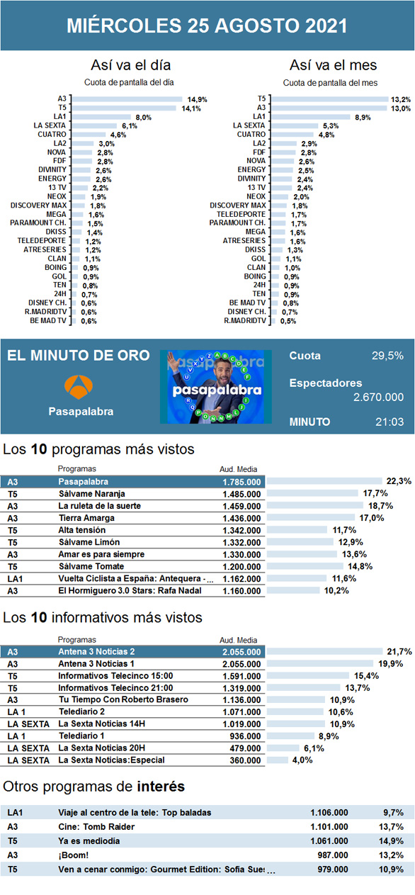Durante el 'prime time', el cine de Antena 3 se proclamó como lo más visto de la noche gracias a Tomb Raider. La película protagonizada por Alicia Vikander no sólo mejoró los bajos registros que venía reuniendo el recién finalizado programa Me resbala, sino que alcanzó los 1,1 millones de espectadores.