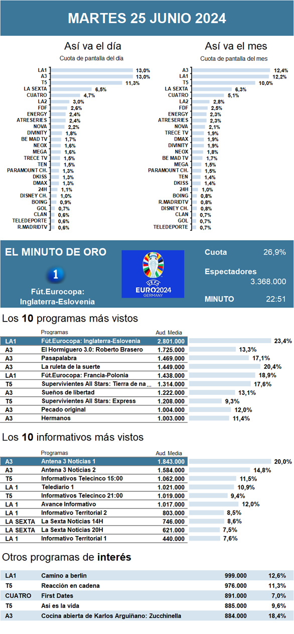 AUDIENCIAS: MARTES 25 DE JUNIO DE 2024