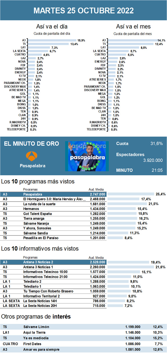 AUDIENCIAS: MARTES 25 DE OCTUBRE DE 2022
