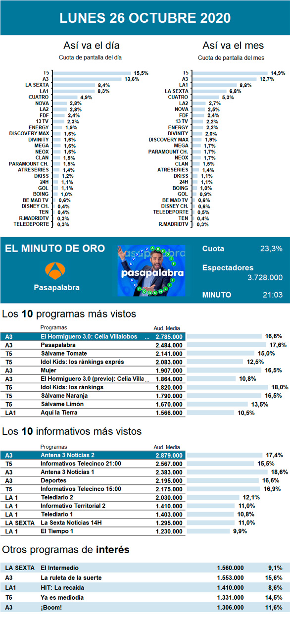 Aunque Mujer volvió a imponerse en espectadores durante el 'prime time' un lunes más, en esta ocasión la serie turca de Antena 3 vio como su principal rival, Idol Kids, le vencía en cuota de pantalla gracias a sus mejores datos de esta primera edición en Telecinco.