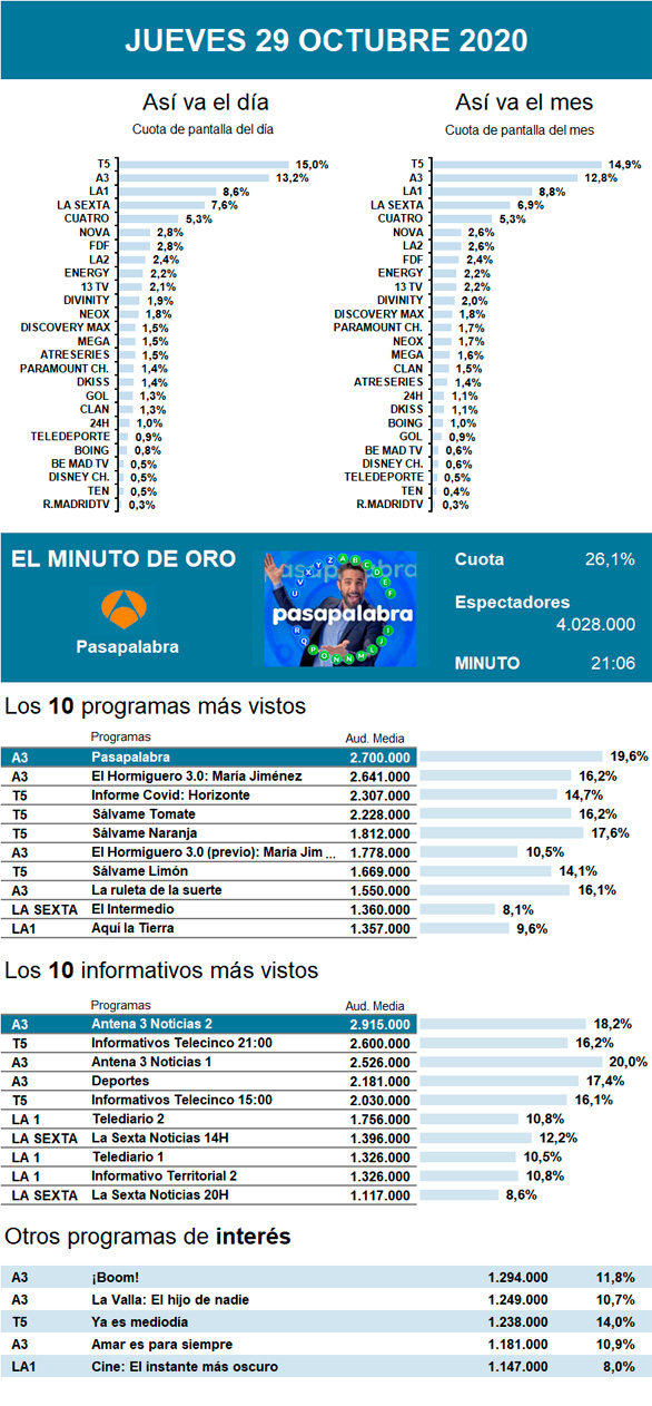 Por detrás, continuó la particular lucha por el control del 'prime time' entre las series de La Valla y de Madres. Nuevamente, la ficción de Antena 3 se mantuvo como la más vista de las dos, mientras que la de Telecinco se volvió a imponer en cuota de pantalla.