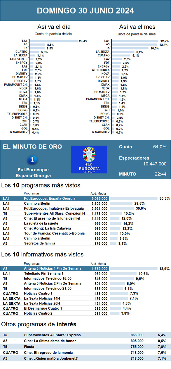 AUDIENCIAS: DOMINGO 30 DE JUNIO DE 2024