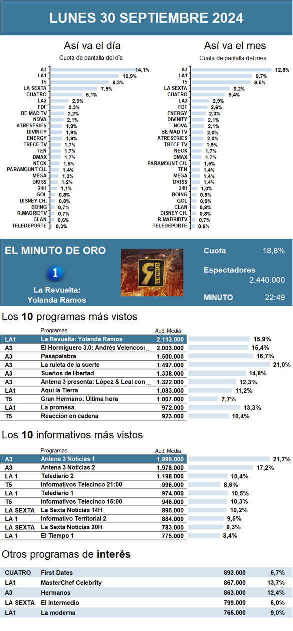 AUDIENCIAS: LUNES 30 DE SEPTIEMBRE DE 2024